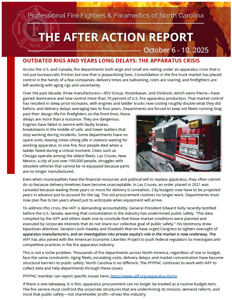 The PFFPNC newsletter for October 6-10 is now posted and includes information on the growing fire apparatus crisis impacting IAFF members across North America. Fire departments are facing skyrocketing costs, multi-year delivery delays, and aging fleets due to consolidation among a few major manufacturers. IAFF General President Edward Kelly has testified before the U.S. Senate, calling for accountability and stronger oversight, while bipartisan lawmakers and federal regulators begin investigating anti-competitive practices. The PFFPNC continues to support IAFF’s efforts and urges members to report apparatus-related issues through the IAFF’s online form to help address this nationwide public safety challenge.