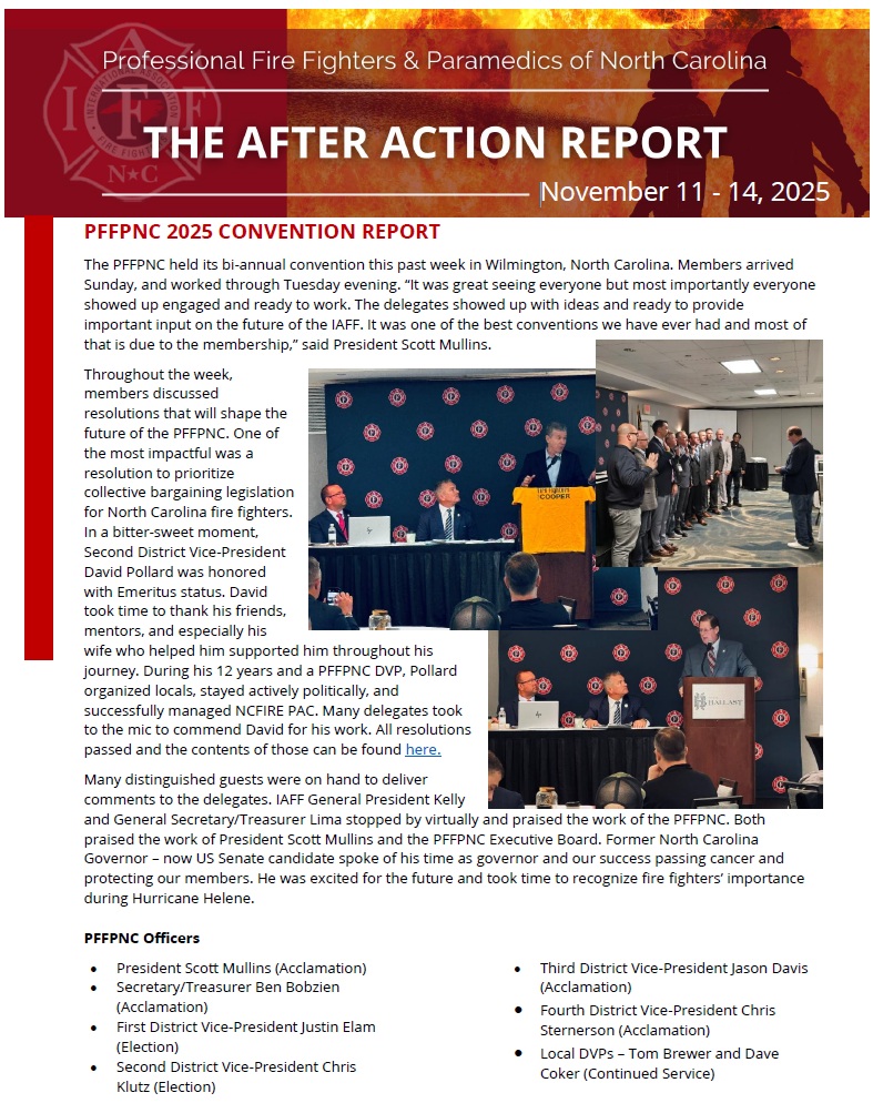 The PFFPNC newsletter for November 10–14 is now posted and includes highlights from a highly successful bi-annual convention held this past week in Wilmington, North Carolina. Members gathered Sunday through Tuesday, engaging in productive discussions and thoughtful decision-making that President Scott Mullins described as “one of the best conventions we have ever had.” Delegates debated and passed several key resolutions, including a major initiative to prioritize collective bargaining legislation for North Carolina fire fighters, and honored Second District Vice-President David Pollard with Emeritus status for his 12 years of exceptional service. Distinguished guests, including IAFF General President Kelly and General Secretary/Treasurer Lima, praised the organization’s progress, while former Governor and current U.S. Senate candidate recognized the PFFPNC’s advocacy and response to Hurricane Helene. The newsletter also includes the results of officer elections and acclamations for the upcoming term.