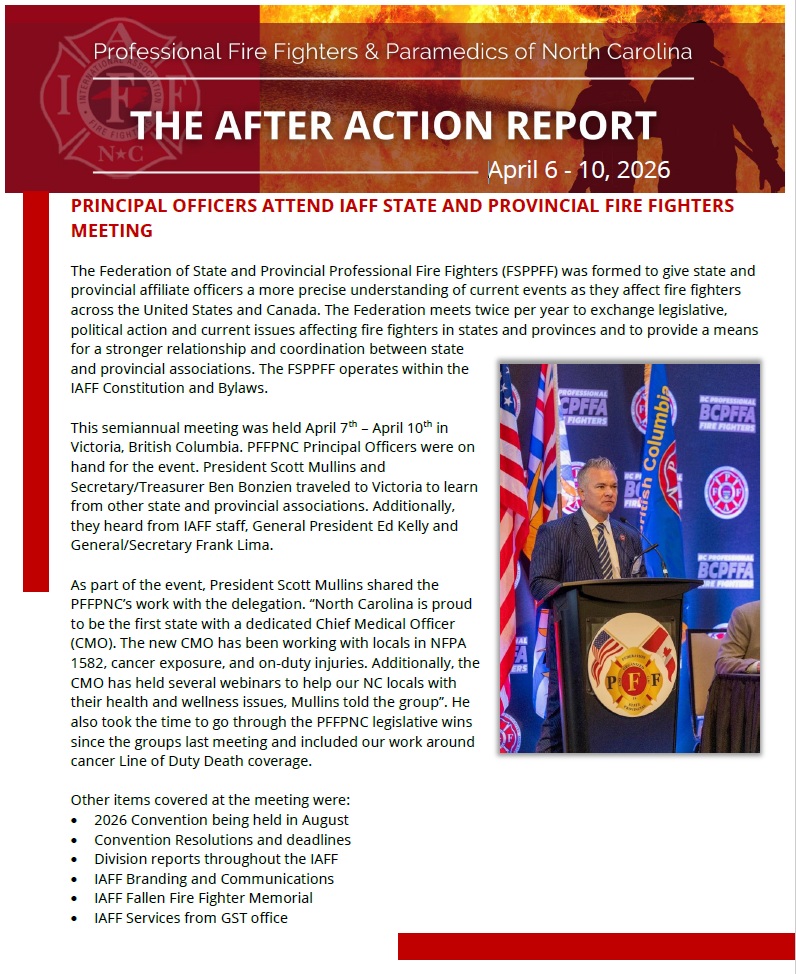 The PFFPNC newsletter for April 6-10 now posted and highlighting North Carolina’s presence on the international stage as PFFPNC leadership joined fire service leaders from across the U.S. and Canada at the Federation of State and Provincial Professional Fire Fighters meeting in Victoria, British Columbia. President Scott Mullins and Secretary/Treasurer Ben Bobzien engaged in critical discussions on legislation, union strategy, and emerging issues, while also showcasing North Carolina’s leadership—especially the groundbreaking work surrounding the state’s first Chief Medical Officer and ongoing cancer-related initiatives. From national collaboration to sharing major legislative wins, this week’s update reflects how PFFPNC continues to lead, influence, and advocate at every level of the fire service.