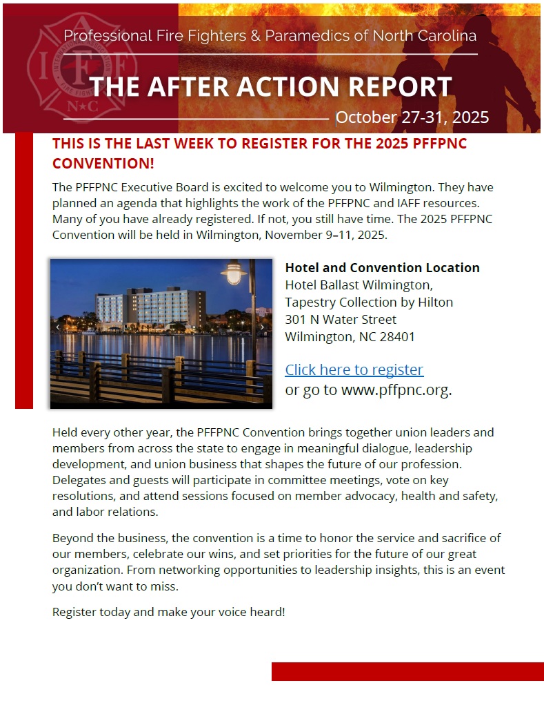 The PFFPNC newsletter for October 27-31 is now posted and includes a reminder that this is the last week to registration for the 2025 PFFPNC Convention. The convention brings together union leaders and members from across the state to engage in meaningful dialogue, leadership development, and union business that shapes the future of our profession. This year, the convention will be held from November 9 – 11 at The Hotel Ballast Wilmington, Tapestry Collection by Hilton in Wilmington, NC.