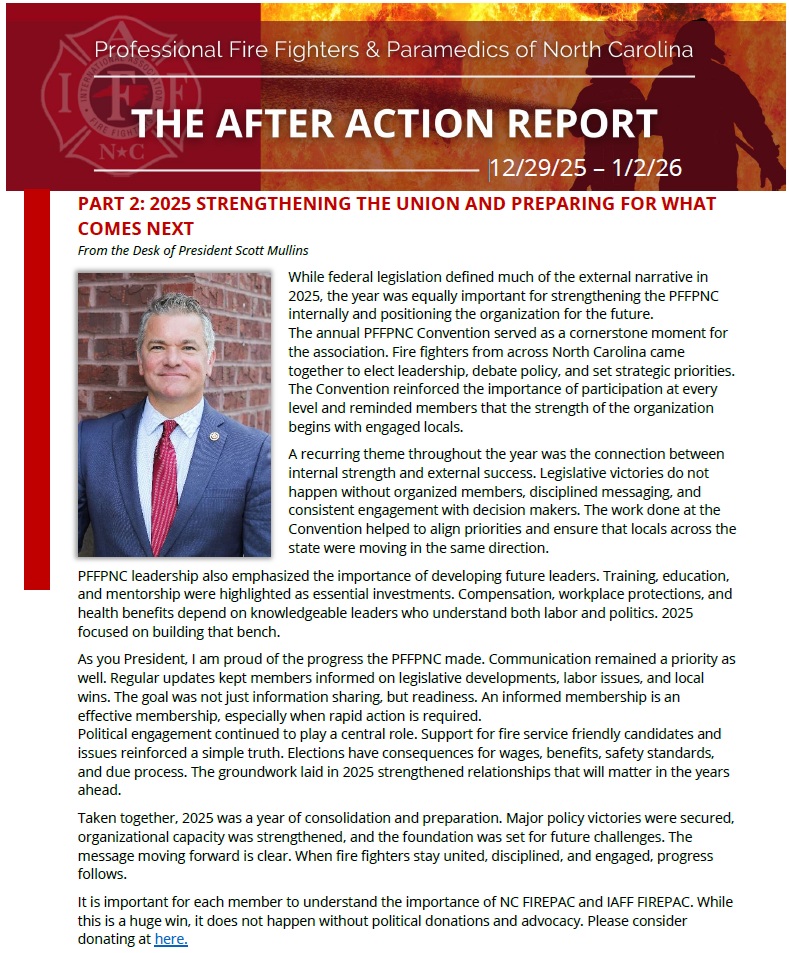 The PFFPNC newsletter for December 29 – January 2 is now posted and highlights how 2025 strengthened the union internally while laying the groundwork for future success. This edition recaps the annual Convention, where fire fighters from across North Carolina came together to elect leaders, set priorities, and reinforce the power of engaged locals. It explores the link between internal organization and external legislative wins, the importance of leadership development, and the role of consistent communication in building readiness. The newsletter also underscores the impact of political engagement and FIREPAC advocacy, reminding members that unity, participation, and sustained involvement are essential to protecting wages, benefits, safety, and due process in the years ahead.
